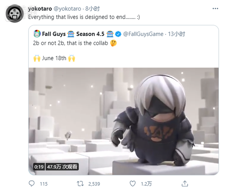 好巧不巧,与这一猜想相对应,横尾太郎转发《糖豆人》联动推特的时候留了句故弄玄虚的话:“一切事物都是为了被毁灭而设计出来……”