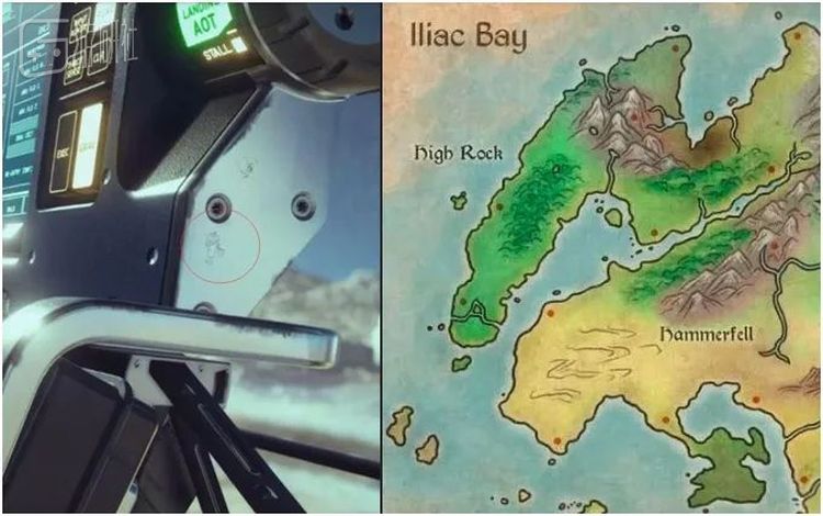 图片右边是《上古卷轴》系列的背景塔玛瑞尔大陆中的伊利亚克海湾,以及高岩省和落锤省地区。而左边这幅图,是这位网友在4K高清《星空》预告片中截图截下的,可以看到图中金属器械上有一个小型图案,看上去十分像右边地图的缩小版。