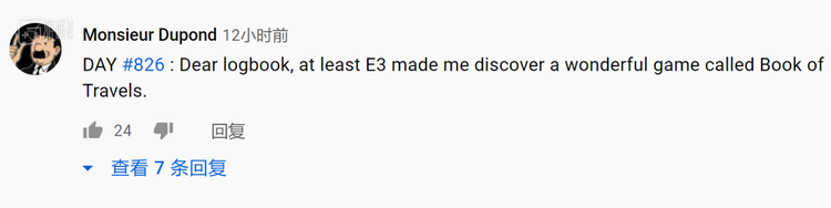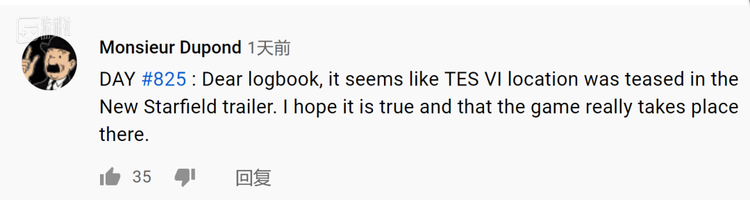 忠实老滚玩家Monsieur Dupond自《上古卷轴6》发布第一支预告视频起每天就在评论区写日记计数,至今已经过去了826天。