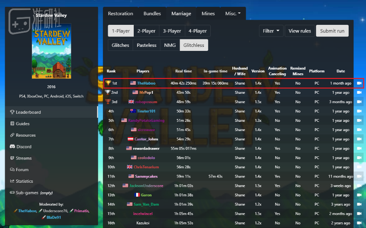 Speedrun速通网站上,“闪婚”项目前二十名记录的“结婚对象”一栏,无一例外全是谢恩(Shane)。