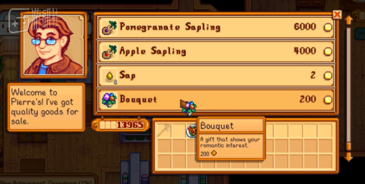 花束是星露谷里建立恋人关系的证明,要在镇上的杂货铺花200枚金币购买。将其赠送给8心好感度的NPC,就能把好感度上限提升至10心,实际对应2749点。