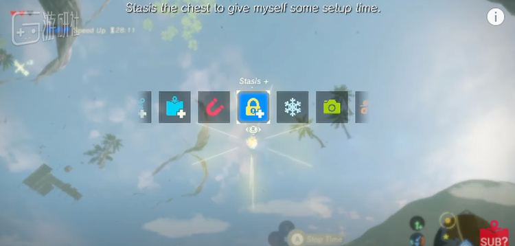 用时间停止停住宝箱后,他往宝箱正下方丢下了一个圆形炸弹(还朝炸弹射了三箭来固定炸弹的位置)同时释放停住的宝箱,读取一次记忆来重置时停的CD,让宝箱再次稳稳停在圆形炸弹的正上方。