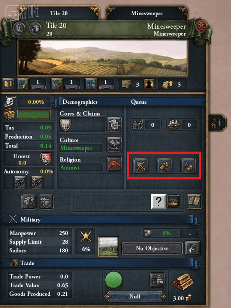 点击省份网格弹出的省份界面,会看到三个提升省份发展度的按钮。在扫雷Mod里,这些按钮的功能与鼠标上的左、右、中键一致,用于揭露省份网格查看是否触雷,或者在某个格子插个红旗标记潜在的地雷。
