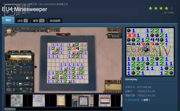 7月5日,Steam用户Sol_InvictusXLII在《欧陆风云4》的创意工坊上传了一个Mod,允许玩家在这款游戏里畅玩扫雷。