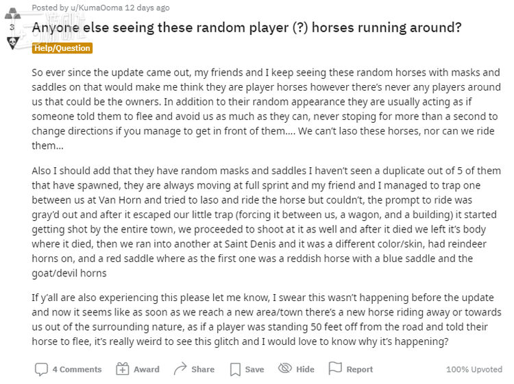 Reddit上一位玩家发帖讲述了自己遭遇“幽灵马”的经历,其中提到他们在多次目睹“幽灵马”的出现后,决定追击它,他们使用套索抓住它并试图骑马,结果发现骑马的提示是灰色。