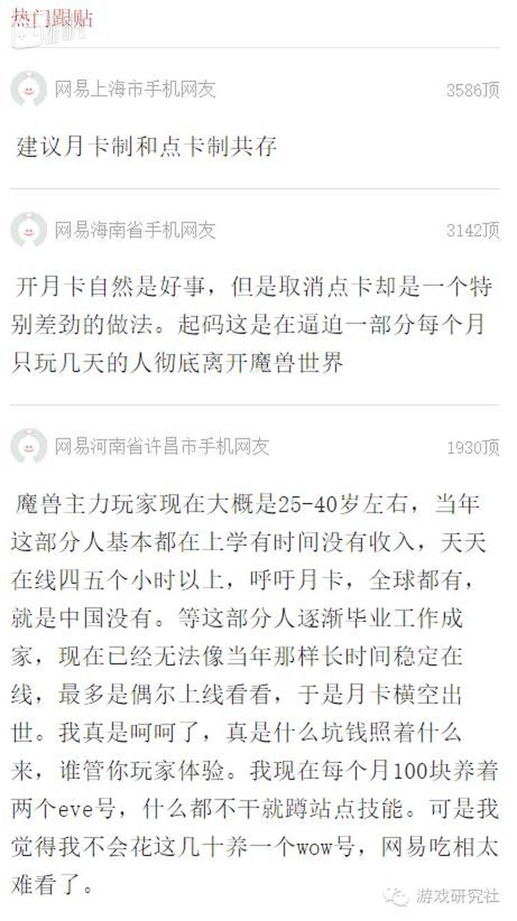 此事在短时间内引起了巨大关注,《魔兽世界》深长久远的影响力在这个时刻迅速显现,释放出巨大的能量。有人拍手叫好,表示月卡很适合自己,有人发出抗议,表示月卡完全不符合自己的生活和游戏节奏——“我就周末玩会,取消点卡,你让我买月卡?”