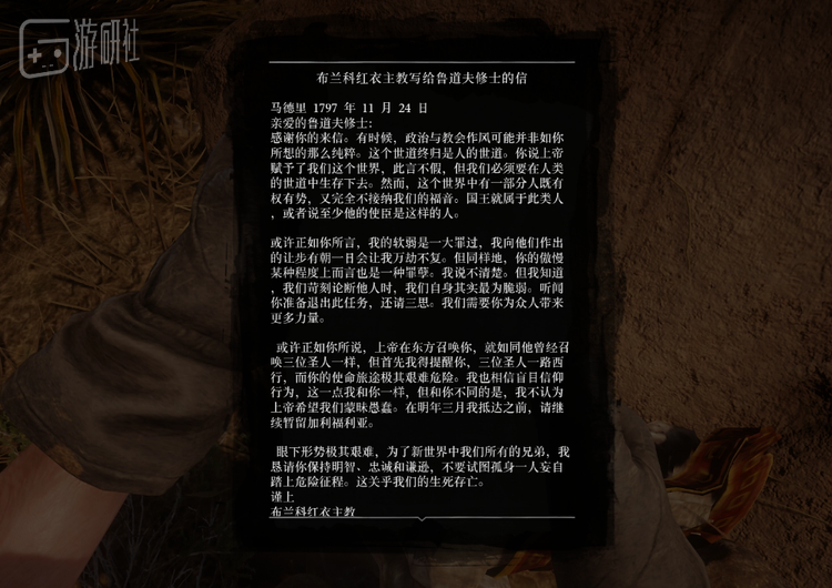 搜刮尸体会获得一封信件,标题为“布兰科红衣主教写给鲁道夫修士的信”,写信的日期为1797年。