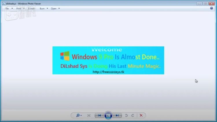 等到第一阶段安装完成,不对劲的事情开始了。一张图片图片弹了出来,上面用夸张的RPG配色写着:“Windows 9 Pro 即将安装完成,DiLshad Sys正在施展他最后的魔法”。