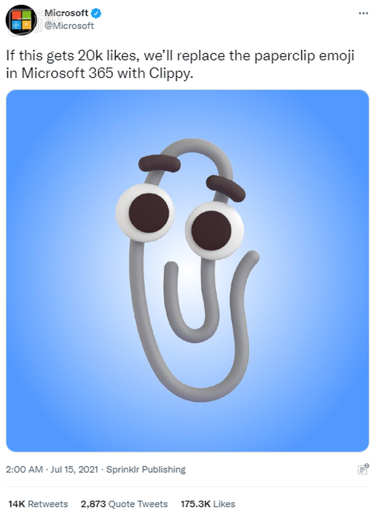 7月14号,微软官方发推向用户们征求意见,称这条推特如果达到两万点赞,他们就计划在Microsoft 365(微软的云办公软件)的表情符号里带回Clippy,出乎意料的是,这个从没受到过欢迎的小助手,仅仅在一个小时就完成了目标。