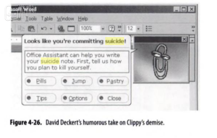 但除此之外,用户们似乎还有更多怨言。Clippy总是从不甘于被用户给忽略,如果你不需要它的帮助对它视而不见,它就会突然吓人地瞪大双眼盯得你毛骨悚然,又或者动辄左摇右摆变成一辆自行车。最让人讨厌的是如果你不回答Clippy的警告,它甚至会突然用力敲击你的显示屏。