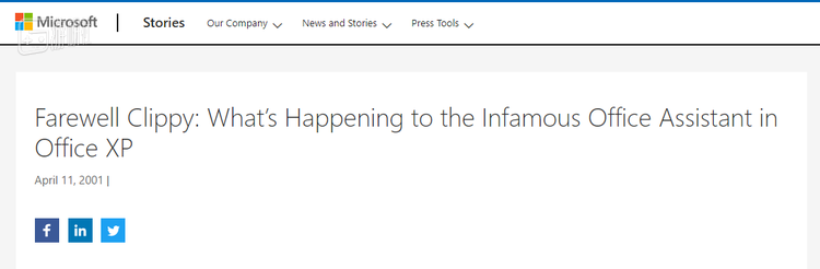 自从Windows XP发布后,微软官方就从未停止过对Clippy的迫害。2001年在Windows XP正式上线之前,微软在官网发布了一篇名为“告别Clippy”的公告,在标题里官方毫不留情地使用了“Infamous(臭名昭著)”这样的字眼来宣告自家产品将要下线隐藏的消息。