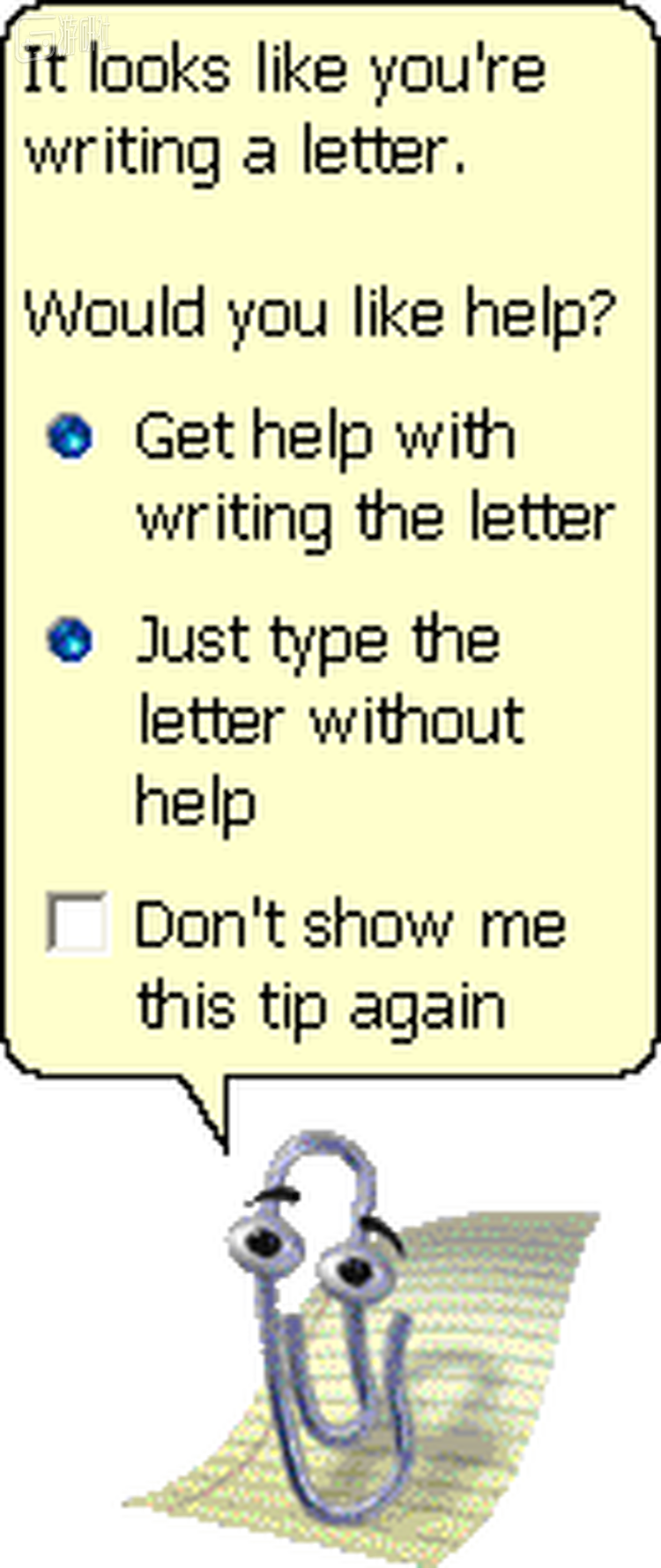 而它所提供的总是一些无用的废话,用人们常用来吐槽它的话来说,就像是在指导“古代人上网”,譬如Clippy会在你打开文件,新建文档之后突然大喊“我看到你正在创建一个新文档!”,或者是一遍又一遍地重复先前说过的话“你需要我帮忙写信吗?”。