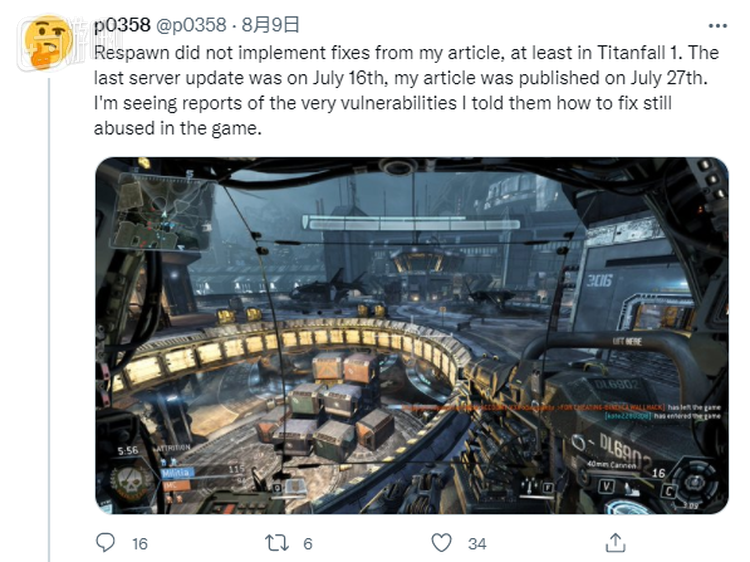 p0358指出,重生从未采取过他的建议修复漏洞,《泰坦陨落1》的最后一次服务器更新发生在7月16日,而他的文章27日才发布。