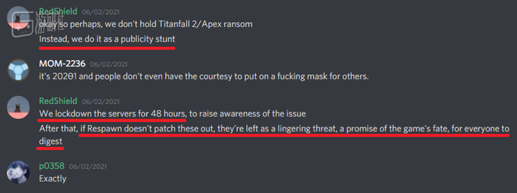 另一条记录表明,RedShield要把对《泰坦陨落2》与APEX的攻击当成一次“公开炫技”:“我们把服务器锁定48小时……如果重生不修复这些问题,黑客攻击的威胁会一直存在,每个人都可以好好思考一下,这些游戏的命运会走向何方。”