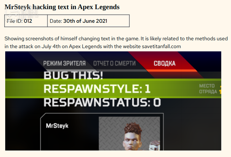 Steyk今年3月便开始使用《泰坦陨落2》的黑名单方式攻击主播并使其掉线。6月30日,Steyk向RF服务器上传了一张截图,证明自己黑入了APEX的文本,这与几天后黑客攻击APEX的手段如出一辙。