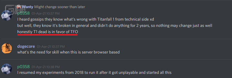 同样因篇幅限制,本文不列出所有证据,只引用报告书的核心观点:RF服务器的上述四位成员,正致力于一个由p0358发起的《泰坦陨落Online》项目,为此不惜牺牲官方的《泰坦陨落》系列,破坏广大玩家的正常游戏体验。
