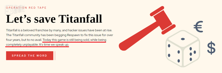 APEX黑客攻击事件中提到的SaveTitanfall网站,建立于2021年3月,网站介绍写道:“今天《泰坦陨落1》仍在销售,却仍然没法玩,我们是时候发声了”。