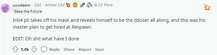 在文章发布一开始,p0358还是玩家口中的“救世主”(The Savior)与“天选之子”(The Chosen One)。一周后,p0358却收到了来自同一批人的谩骂与指责,玩家们纷纷痛斥道:p0358才是攻击《泰坦陨落》服务器的幕后黑手。