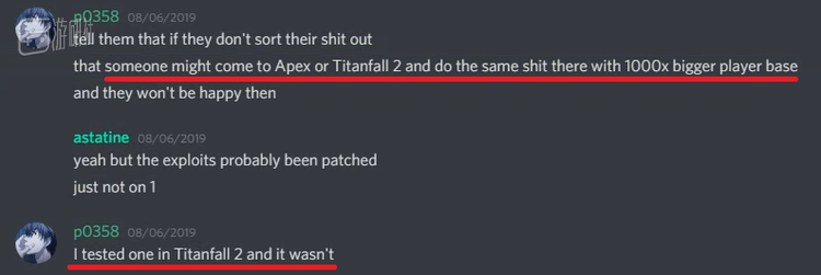 报告书翻出了2019年的一条聊天记录,以证明那时的p0358便希望有人对“千倍玩家基数”的APEX和《泰坦陨落2》进行攻击;他还说1代的某个漏洞在2代里仍未被修复。