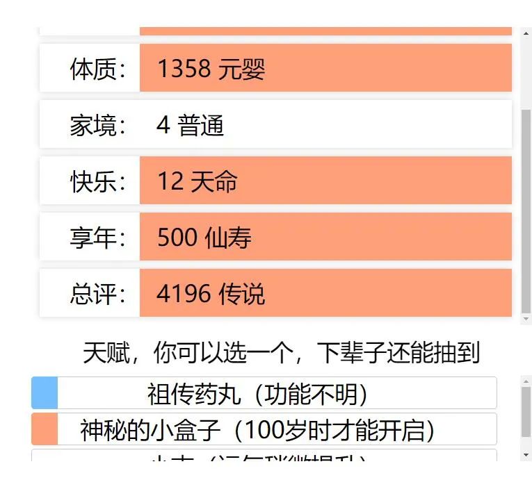 不满意的话,还可以带着你最心水的一项天赋,进行下一次重开。按理来说这游戏像张白纸一样容易看透,但因为魔性的文本、大量离奇的世界线变动,这个点击游戏有一种莫名的反复重开魔力,我一口气就重开了一百来次。