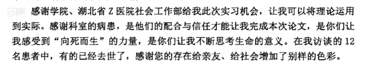 一篇名为《癌症晚期患者死亡认知的社会工作实务探索》的论文致谢格外令人印象深刻: 这篇论文在调研过程中,多位癌症晚期患者提供了宝贵的数据,但却在作者完成文章之前遗憾离世。