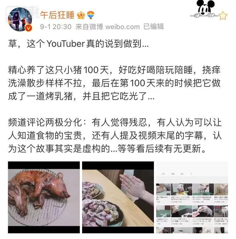 但故事的结局似乎没有改变。第100期视频如期上线,视频中的主角变成了上图中的那只流油的烤乳猪。