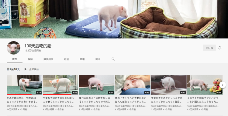 “100天后要被吃掉的猪”频道引人瞩目的点非常直观,以视频主角死亡为终点,以视频内容进行倒计时。每个视频的长度都挺短,平均在3分钟左右。