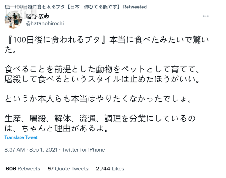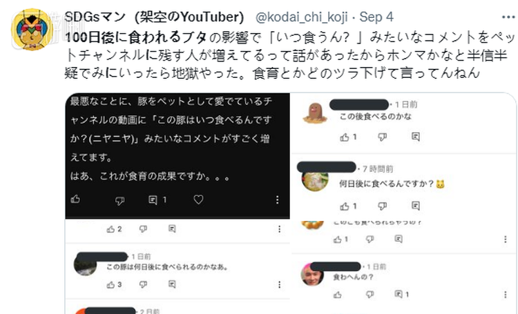 实际上,“100天后要被吃掉的猪”非常清楚自己的计划引起的道德讨论——频道的官方推特经常浏览网友的针对此事的言论,且会点赞两个意见方向完全相悖的言论。