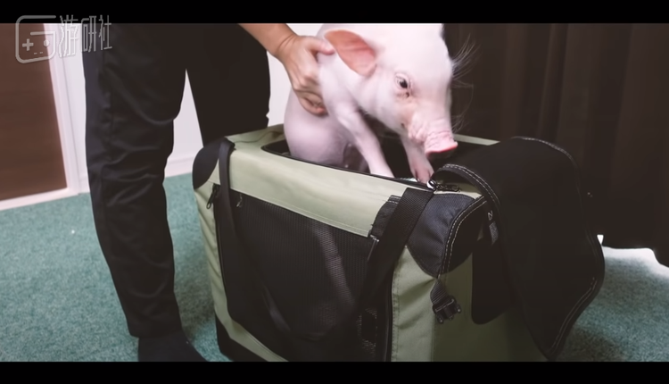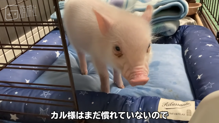 视频中迷你猪懵懂又好奇地到处探索,和主人熟络后用鼻子拱他的手臂。Cal还有一个整齐漂亮的大笼子,里面摆着早已铺好了的毯子。一切看上去和养宠物日常没什么不同。