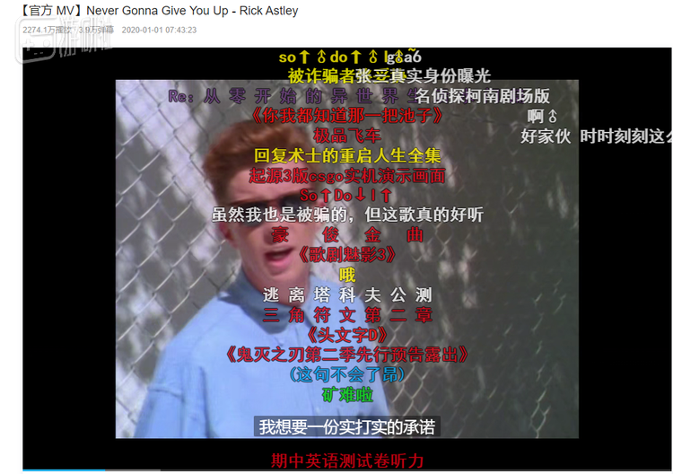 和它在YouTube上惊人的点击量一样,索尼音乐去年在B站上传了这首歌的官方高清版本,只过了短短一年,它在B站的播放量就已经突破了两千多万,而且就算官方这回使用了最准确的标题,在弹幕和评论区里依旧有不少“愿者上钩”,自愿被骗进来的观众。