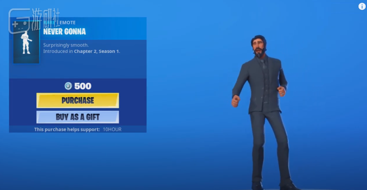 去年年初,《堡垒之夜》也试图蹭一蹭这个梗的热度,但使用的手段也不再是十多年前的“标题党恶作剧”,而是直白地将MV里Rick舞蹈做成了一个表情动画: