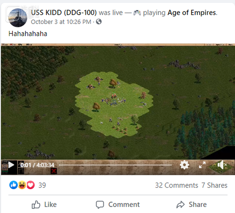 从10月3日晚开始,这个名为“USS KIDD”的海军军舰官方帐号一改平日里严肃冷酷的文案风格,配上了“Hahahaha”的文案,然后非常敬业地直播了四个小时的《帝国时代》游戏。
