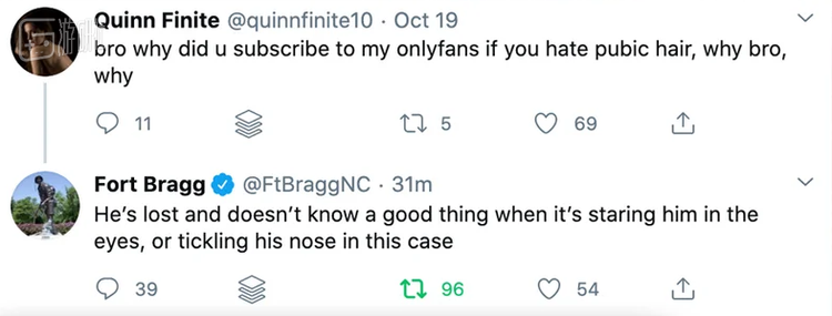 而这也不是美国军方第一次在社交平台上出乌龙了,去年,美国军事基地布拉格堡的推特帐号就突然和一名推特用户就Onlyfans上的色情博主评头论足,最后才发现是因为该推特的运营者忘记切换帐号了。