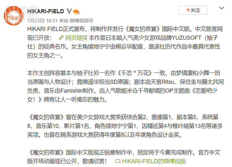 柚子社在前几年就开始战略布局海外市场,去年更是接连为自家的《千恋万花》《Riddle Joker》推出Steam版并同步更新中英文,还在今年宣布为2015年的人气作《魔女的夜宴》更新中文。