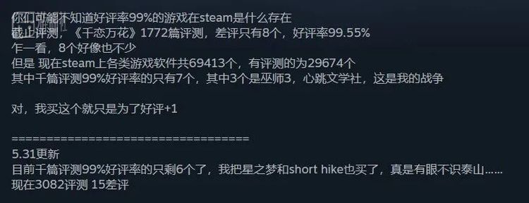 值得一提的是,柚子社2016年的作品《千恋万花》在Steam的好评率高达99%。在上万款Steam游戏中,达成如此高好评率的游戏连10款都不到。
