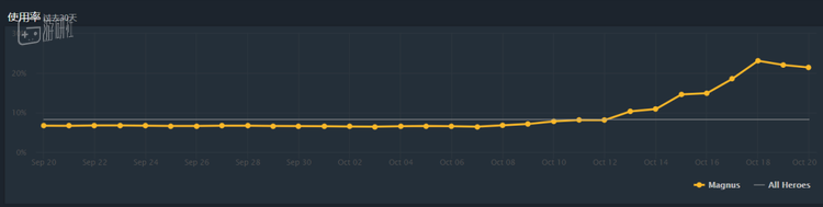 随着马格纳斯在Ti10比赛中崭露头角,他在游戏中的使用率也陡然上升(数据来自DOTABUFF.com)