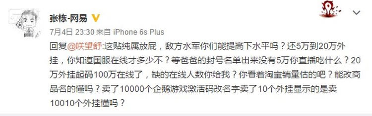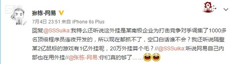 该帖截图在网上扩散之后,影响颇广,加之其中揣测网易内部人员参与了外挂制作,很快网易暴雪合作部市场总监张栋对此进行了激烈的非正式回应,并暗指竞争对手有意祸害。