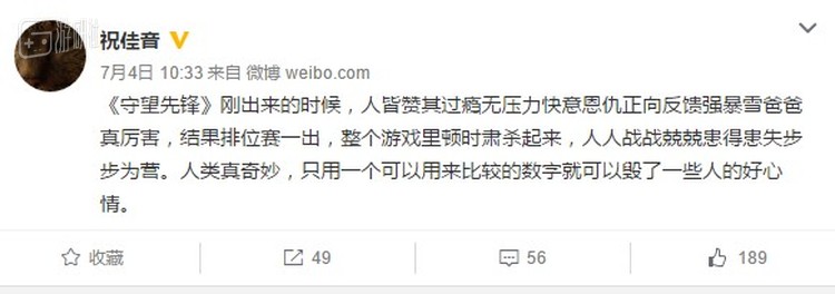 7月4日,知名游戏人@祝佳音 在体验了排位赛之后,写下这么一条微博,可以说惟妙惟肖地刻画了很多玩家在排位赛功能加入前后心态上的改变。