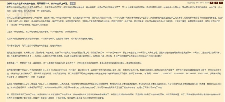 从帖中内容来看,先不论楼主所说的消息是真是伪,真实情况是否如贴中那般严峻,起码论述方式明显是有些不科学的。比如使用淘宝销量来推算外挂规模,但事实上淘宝商品可以改名,商品的售出数字未必真实反映了当前商品的销量。由这一数字推断出来的“外挂人数”和“外挂产业链规模”自然站不住脚。