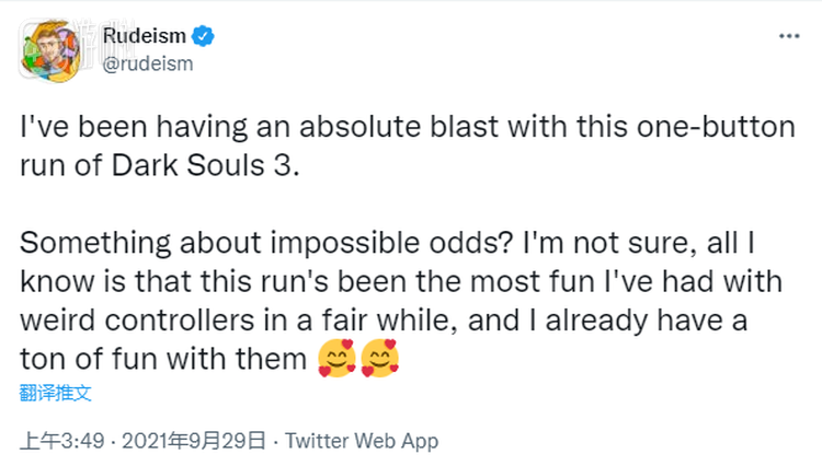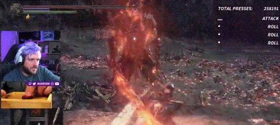 在按了258250次按钮后,最终BOSS“薪王们的化身”也倒在了这根手指之下,Rudeism终于击败了《黑暗之魂3》本体中的所有BOSS。他承认这是他经历过的最难的一次挑战,却也是最开心的一次。或许是激活了什么奇怪的属性,他甚至还想继续挑战DLC的内容。