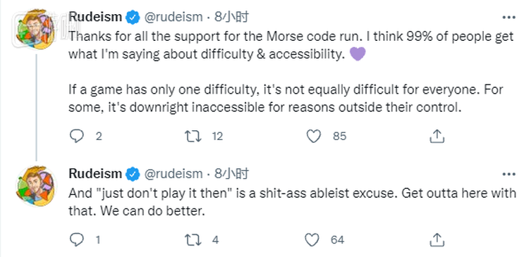 鉴于有不少人拿他一根手指通关黑魂的经历,当作游戏不需要简单模式的论证,他也再次强调,游戏也需要考虑到那些不能完整体验游戏的残疾人玩家。看起来,这场表演背后的故事还是挺暖心的。