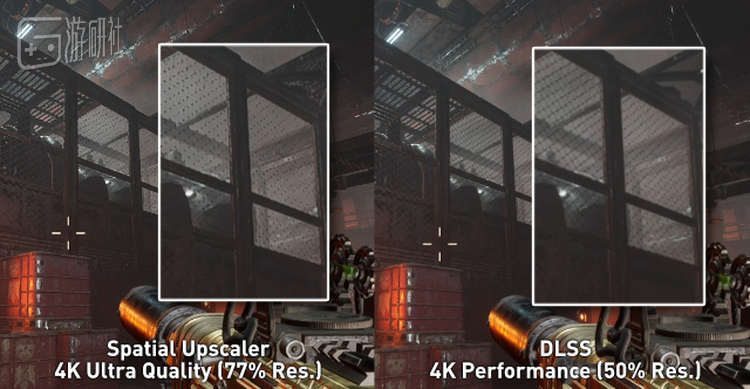 空域上变换算法的分辨率提升(左)在细节上的表现力有时甚至不如渲染分辨率更低的DLSS(右)