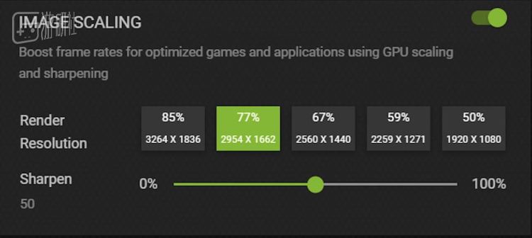 在新版本的GeForce Experience里面,可以很方便地对画质进行调节,同时这个功能也集成在了一键优化里面。和FSR不同,NIS简单粗暴地直接标明了渲染分辨率,从85%到50%一共五档。77%的分辨率实际上就对应的是FSR的超高质量模式了,而85%分辨率提供了一个质量更高的选项。