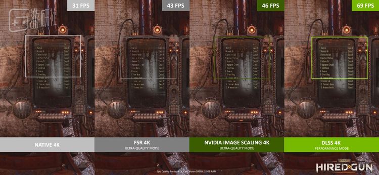 左到右:原生4K,FSR 4K,NIS 4K和DLSS,可以看到DLSS在更好表现细节的前提下,帧数反而更高