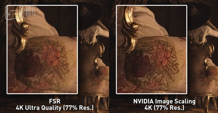利用NVIDIA提供的ICAT图像对比工具可以看到,NIS比起FSR在细节锐化上还是有一些表现上的差别。同样使用77%分辨率的超高画质模式,NIS的细节锐度感觉比FSR还是要好上一些。