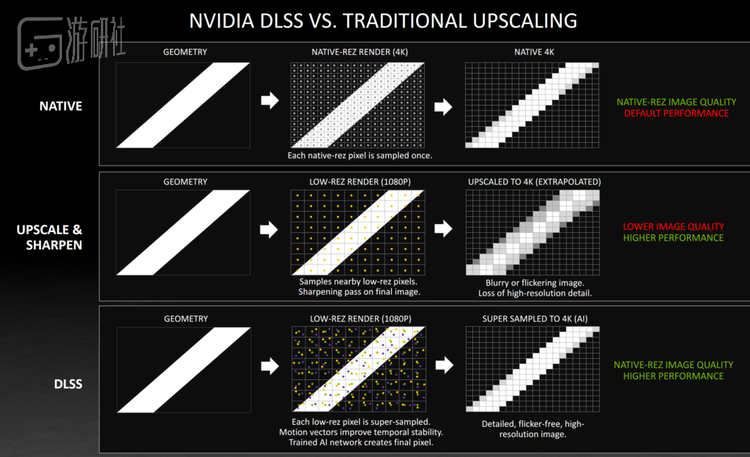 总体来说,AI算法可以更好地适应更多复杂的渲染情况,更准确地“猜”出缺失的画面信息。而程序员手动调整的算法,只能保证在大部分情况下大差不差,但是一旦原生分辨率降低,原始信息减少,补充信息的准确率就差强人意了。