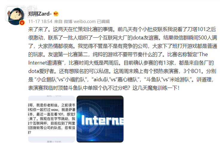 “刀塔101”未来的成效我们无从知晓,但社区玩家们已经有了更积极的反馈。比如一位互联网大厂的玩家看完101后感触颇深,自发联系一批同行兼玩家打算组织友谊赛——这场由腾讯、阿里、米哈游以及斗鱼等等互联网公司组成的比赛被戏称为“The Internet”(Ti),本周末,有几家公司的队伍已经率先展开了表演赛。