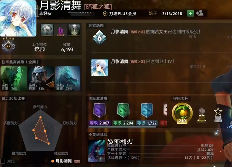 不过后续发展有点出人意料。在彦姐越玩越投入的时候,她的先生反倒越玩越少、化身成了云玩家。反而是她从冰女开始,接触了越来越多的英雄,彻底陷入了这个游戏的魅力中无法自拔——按照她自己的说法,DOTA2几乎天天都要玩,过去八年里,只有半年时间因为工作原因实在没空碰游戏。