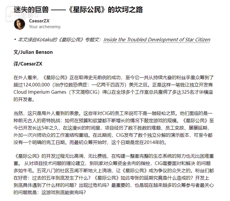 到1.24亿时,我甚至特地翻译了Kotaku唱衰《星际公民》的超长专题文来提醒自己不要鬼迷心窍。