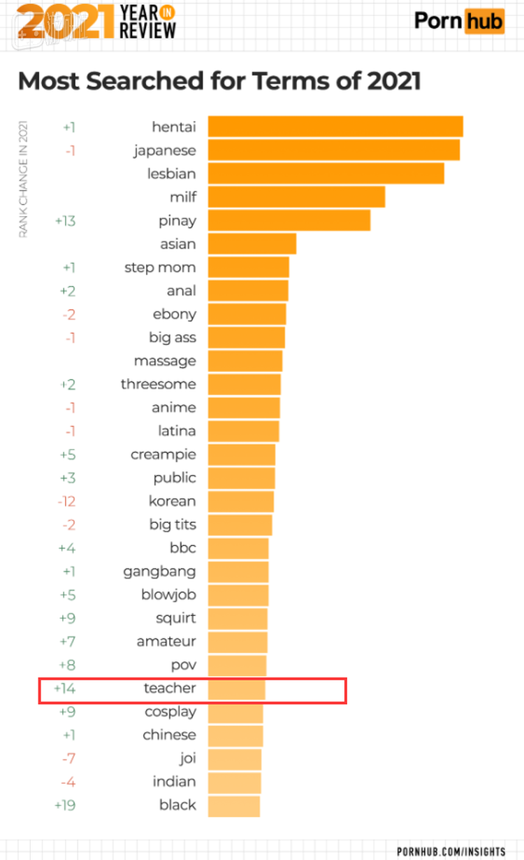 另外根据P站给出的数据,今年上榜的一些热搜词中,除了大部分我不太好打出的词语外,“Teacher”激增14位,也在排行榜中占据了一席之地。